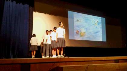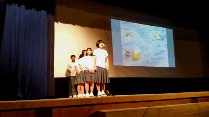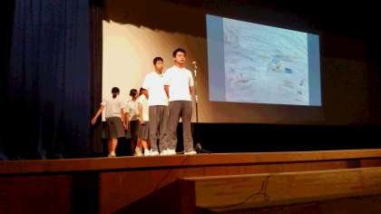 本校からは、生徒会役員が参加し、スライド劇「ケーイ 命がおしえてくれたもの つしま丸・沖縄戦」を発表しました。