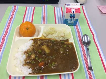 ビーフカレーライス(米粉)、キャベツのピクルス、冷凍みかん、牛乳