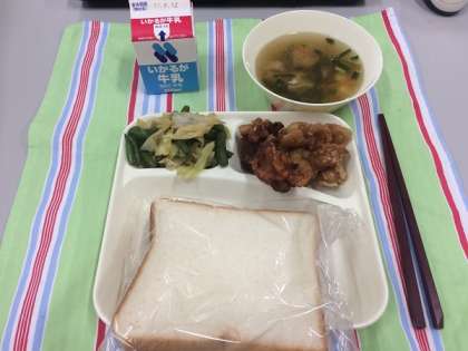 鶏肉のピリからあげ、中華スープ、キャベツと三度豆のあえもの、食パン、牛乳