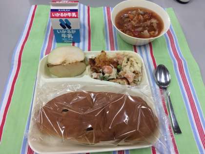 えびグラタン、トマトスープ、なし(二十世紀)、ぶどうパン、牛乳