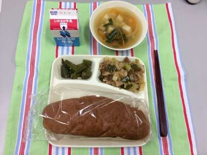 ホイコウロー、とうふのスープ、オクラの中華あえ、パン、牛乳