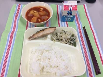 さけのバジル焼き、大豆とごろごろ野菜のトマト煮、三度豆ともやしのサラダ、ごはん、牛乳
