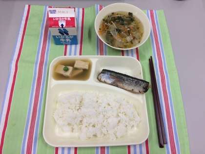 さんまのさんしょう焼き、すまし汁、高野どうふの煮もの、ごはん、牛乳