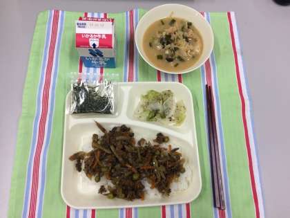牛肉のきんぴらちらし、みそ汁、キャベツの赤じそあえ、ごはん、牛乳