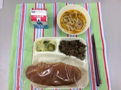 牛肉のカレー風味焼き、トマトのスープスパゲティ、キャベツときゅうりのピクルス、ぶどうパン、牛乳