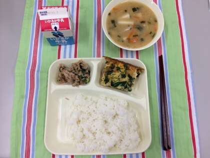 千草焼き、みそ汁、ツナっ菜いため、ごはん、牛乳