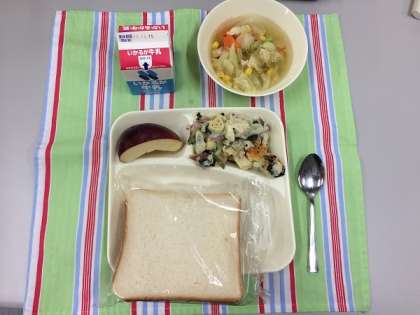 スープ煮、ほうれんそうのグラタン、りんご、食パン、牛乳
