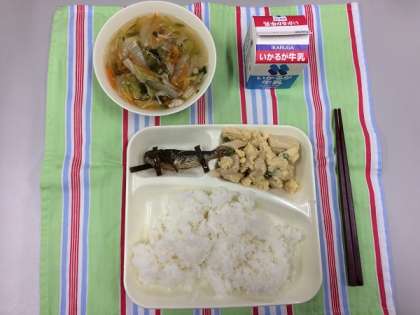 いわしのしょうが煮、うすくず汁、高野どうふの卵とじ、ごはん、牛乳
