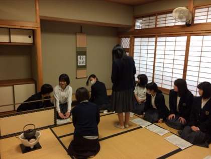 本日の放課後、4階にある和室で、学校元気アップ地域本部事業の取組として、「茶道教室」が開催され、約20名の生徒や教職員が参加しました。