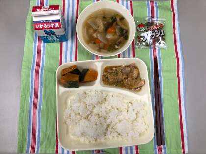 鶏肉と白ねぎのいため煮、のっぺい汁、焼きかぼちゃのごまだれかけ、アーモンドフィッシュ、ごはん、牛乳