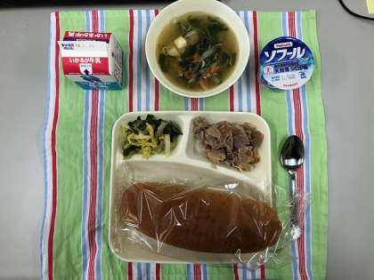 豚肉のオイスターソース焼き、糸寒天のスープ、ピリ辛あえ、ヨーグルト、パン、牛乳
