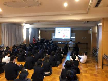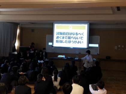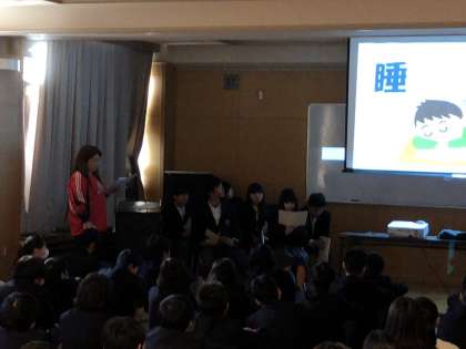 この学習を進めてたのは、2年生の保健委員のみなさんで、パワーポイントのスライドを使いながら、「睡眠の大切さ」「効果的な睡眠の方法」などを紹介してくれました。