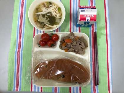 豚肉とごぼうの煮もの、なにわうどん、プチトマト、ぶどうパン、牛乳
