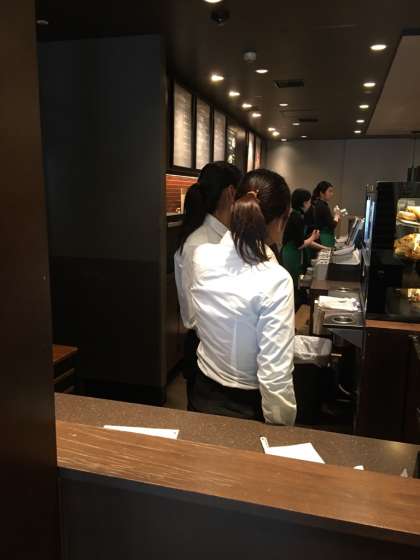写真は、コーヒーショップの「スターバックス 天王寺ミオ店」での様子です。