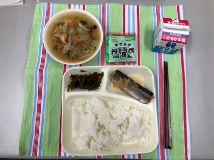 さんまのみぞれがけ、五目汁、茎わかめのつくだ煮、ソフト黒豆、ごはん、牛乳