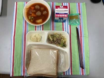 ミートボールと野菜のケチャップ煮、ツナと野菜のソテー、カリフラワーのレモン風味サラダ、パン、牛乳