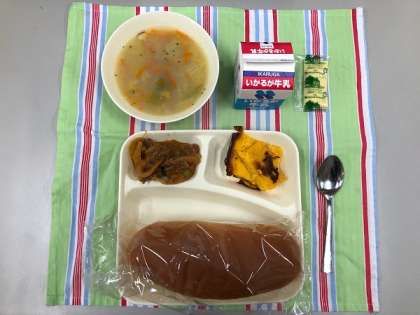 牛肉のデミグラスソース煮、コーンスープ、かぼちゃのプリン、パン、牛乳