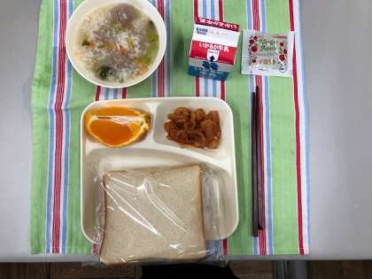 えびのチリソースいため、中華がゆ、デコポン、食パン、牛乳