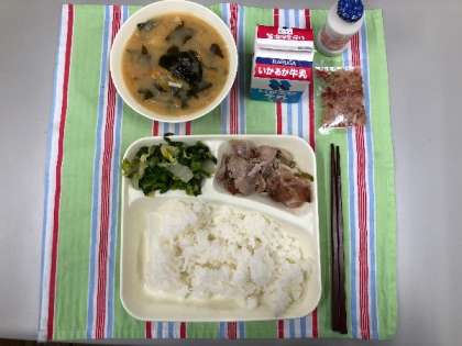 豚肉の梅風味焼き、みそ汁、菜の花のおひたし、ごはん、はっ酵乳、牛乳
