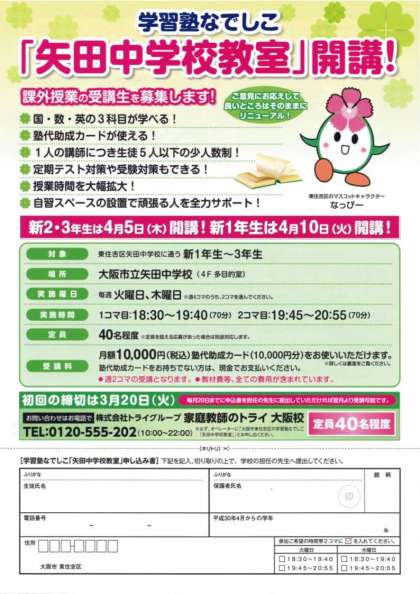 昨年10月より開講している「学習塾なでしこ『矢田中学校教室』」の、平成30年度受講の申込みを現在受け付けております。