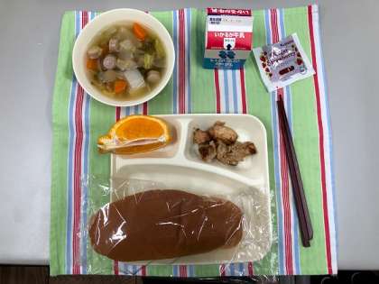 鶏肉のマヨネーズ焼き、ウィンナーのスープ煮、清美オレンジ、パン、いちごジャム、牛乳