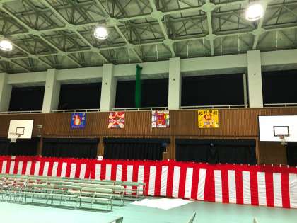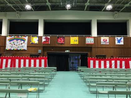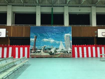 式場の壁面には、1年生からの学級旗や、2年生の文化祭で作ったモザイク画などが展示されています。