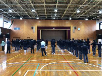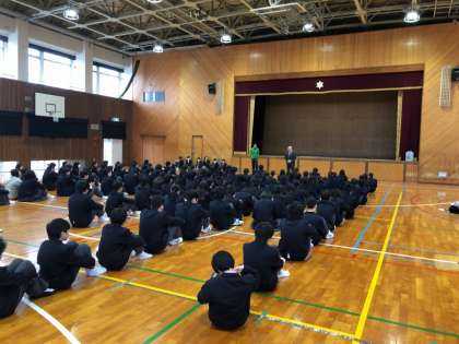 本日は月曜日なので、全校集会が開かれましたが、先週に3年生が卒業をしたため、1年生と2年生のみの集会となりました。