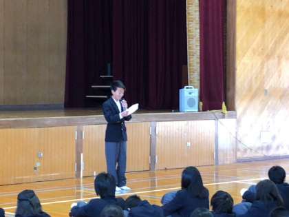 最後に、生徒会長から、本年度の活動の反省や成果が発表され、翌月曜日(26日)の午前中に大和川河川敷で行われる、矢田7校の取組の「春ごと」への参加呼びかけがありました。