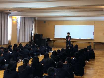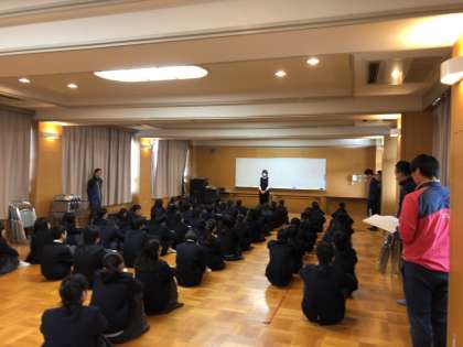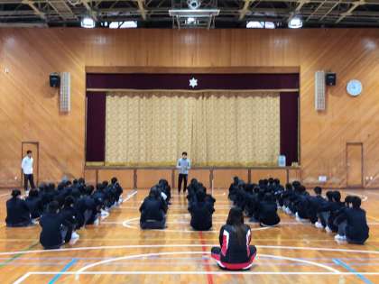 写真は、上から順に、1年生・2年生・3年生の学年集会の様子です。