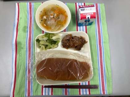 豚肉のデミグラスソース、スープ、キャベツとピーマンのソテー、パン、牛乳