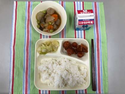 まぐろのオーロラ煮、さといもと野菜の含め煮、キャベツの梅風味、ごはん、牛乳