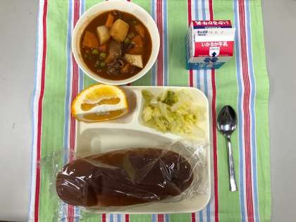 ビーフシチュー、キャベツのピクルス、甘夏かん、パン、牛乳