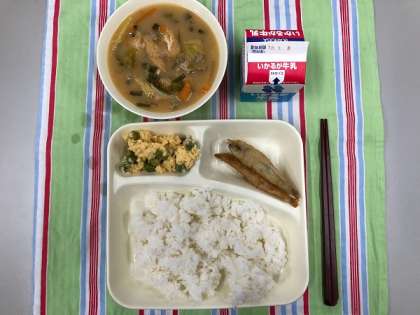 きびなごてんぷら、みそ汁、えんどうの卵とじ、ごはん、牛乳