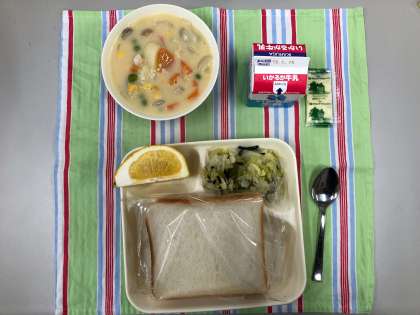 コーンクリームシチュー、キャベツのひじきドレッシング、河内ばんかん、食パン、マーガリン、牛乳