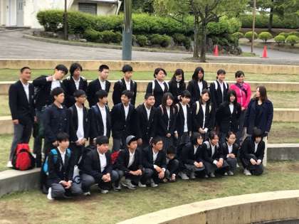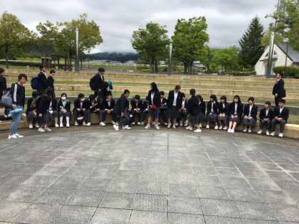 最初に着いたのは、「飯田運動公園」で、昼食前に学級写真の撮影などを行いました。