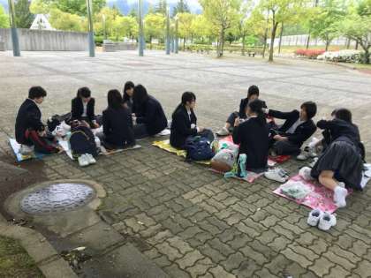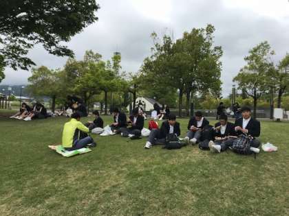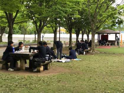 写真撮影に引き続いて、飯田運動公園内で、クラスごとでまとまって、お弁当(昼食)を食べました。