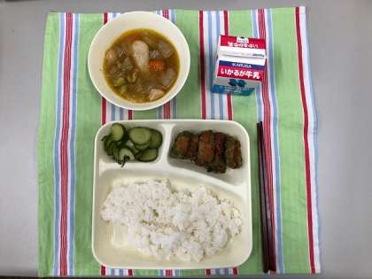ちくわのいそべあげ、鶏肉とさといもの煮もの、あっさりきゅうり、ごはん、牛乳