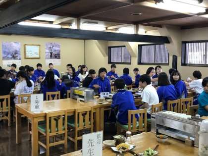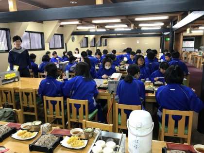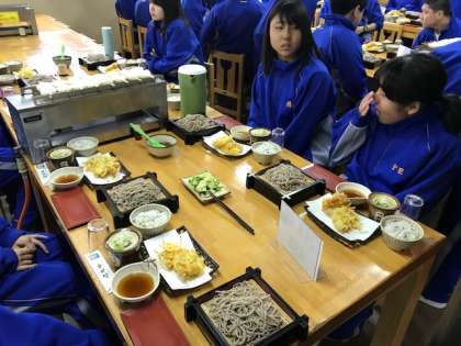 午前のプログラムを終えた修学旅行一行は、「そば処 伊那路」というところに集まって、昼食をいただいています。