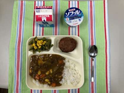 牛肉と大豆のカレーライス、焼きハンバーグ、三度豆とコーンのサラダ、ヨーグルト、牛乳