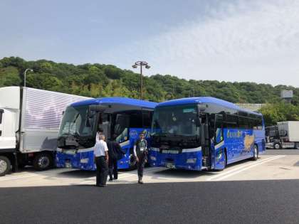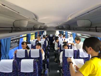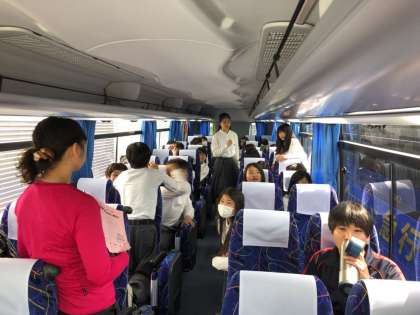 一泊移住は、学級ごとにバス2台に分かれて移動します。途中の紀ノ川サービスエリアで休憩を取りました。楽しいバスの車内の様子です。