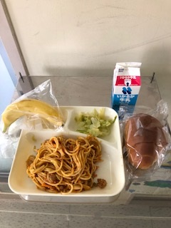 カレースパゲッティ、キャベツのサラダ、バナナ、パン、牛乳。今日もおいしそうです。