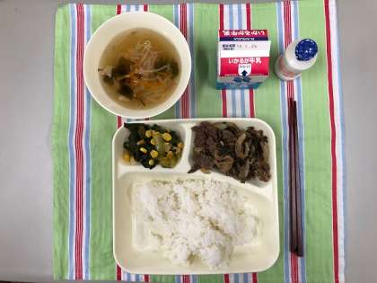 プルコギ、とうふのスープ、チンゲンサイとコーンの甘酢あえ、はっ酵乳、ごはん、牛乳