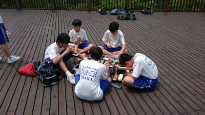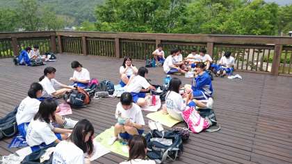 校外学習の午前中の取組を終えた2年生は、兵庫陶芸美術館のテラスをおかりして、昼食をとっています。