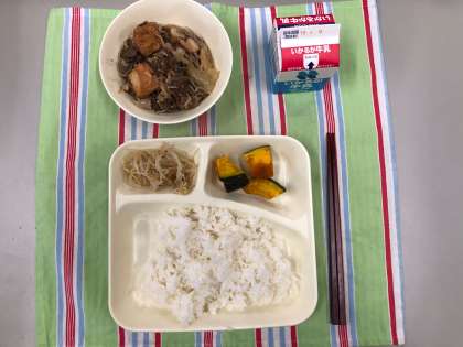 すき焼き煮、焼きかぼちゃの甘みつかけ、もやすのごま酢あえ、ごはん、牛乳