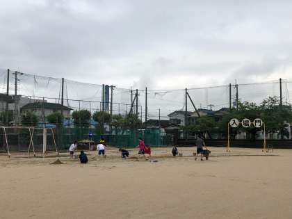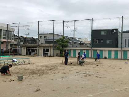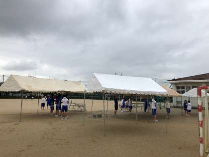 体育大会の10時開式に向けて、早朝から、生徒会役員やクラス委員のみなさんや教職員を中心に、グランドコンディションの回復や会場設営をしています。