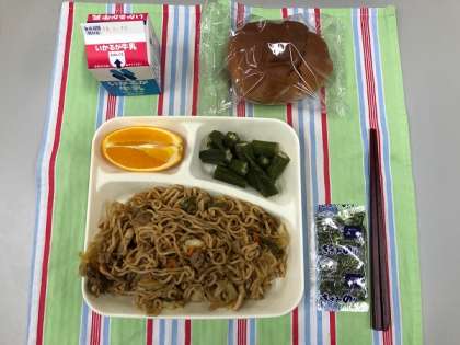 焼きそば、オクラの中華あえ、オレンジ、1/2パン、牛乳