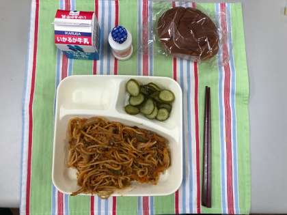 スパゲッティミートソース、きゅうりのバジル風味サラダ、はっ酵乳、1/2パン、牛乳