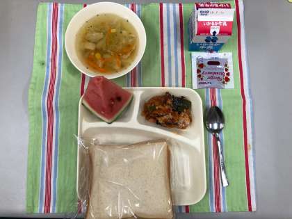 かぼちゃのミートグラタン、スープ、すいか、食パン、牛乳