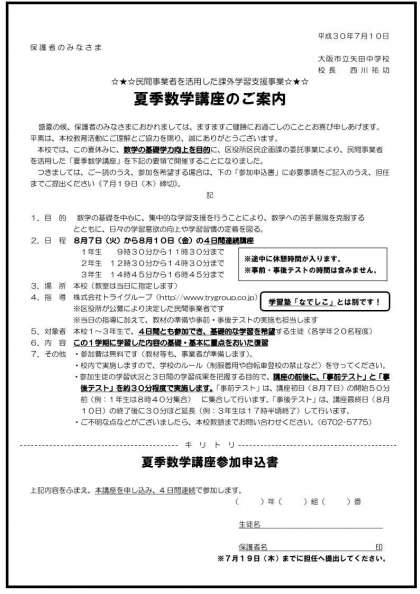 本校では、この夏休みに、数学の基礎学力向上を目的に、区役所区民企画課の委託事業により、民間事業者を活用した「夏季数学講座」を下記の要領で開催することになりました。