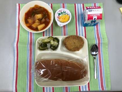 チキンレバーカツ、ケチャップ煮、キャベツときゅうりのサラダ、みかんゼリー、パン、牛乳